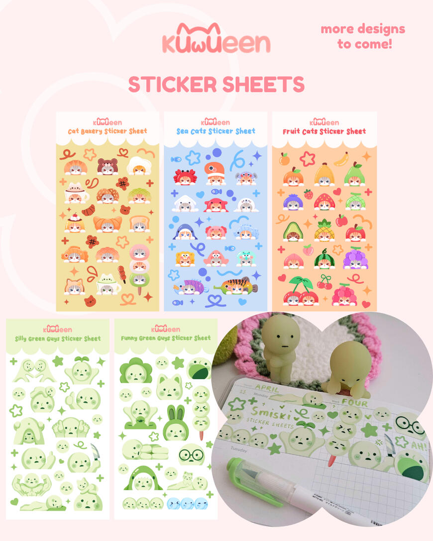 My name is Liz and I am a Melbourne, AUS based Illustrator and Designer!Kuwueen is a small sticker business based in Melbourne that focuses on bringing adorable and silly art to life through stickers. I love decorating everything I own with silly little stickers and hope to share that love with the world. I mainly focus on peeker stickers for cars but have expanded to mini stickers for smaller items and sticker sheets for journalling! I am also planning to create enamel pins, tote bags and plush keychains in the very near future! I currently sell online globally and at art markets in Australia.